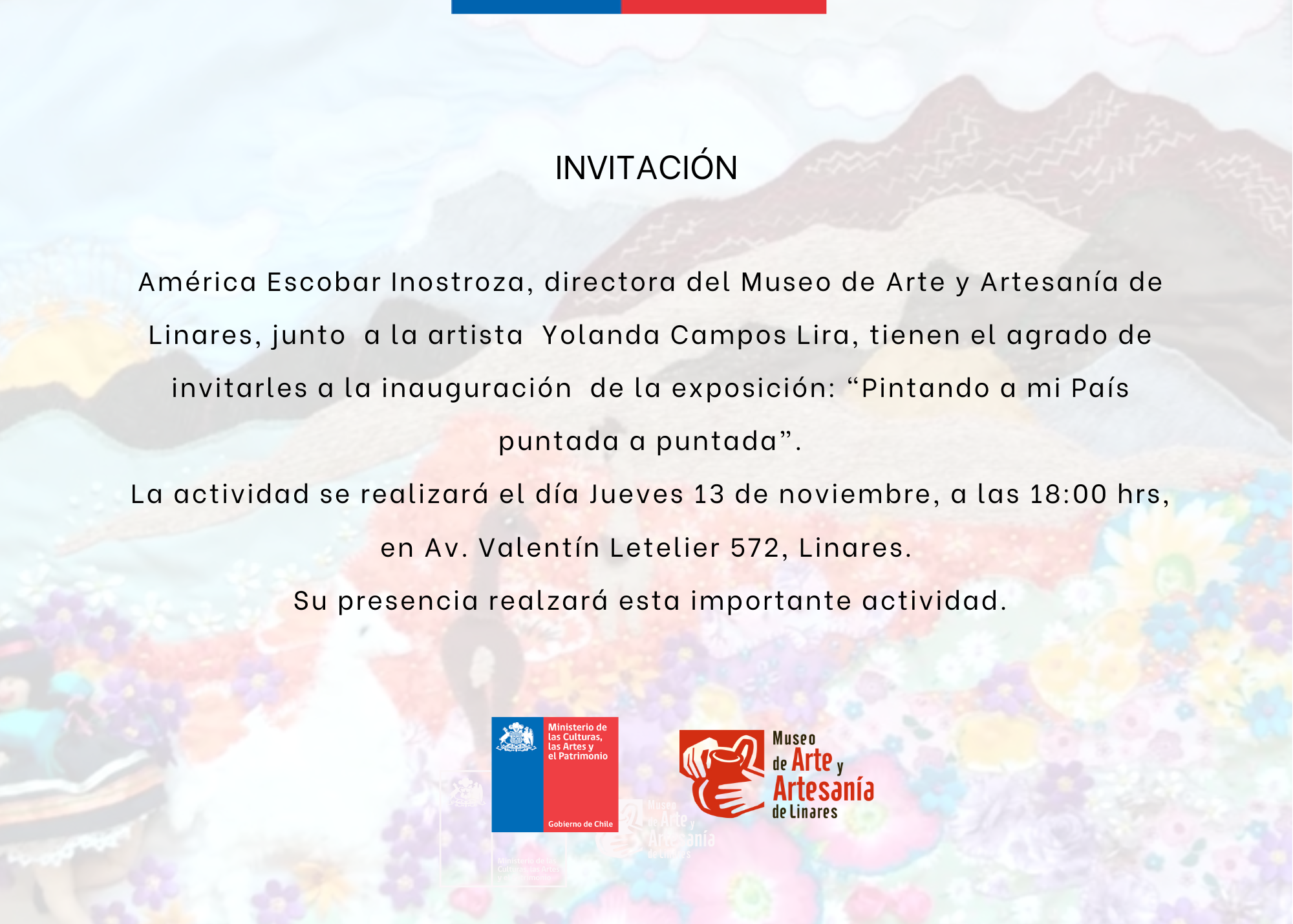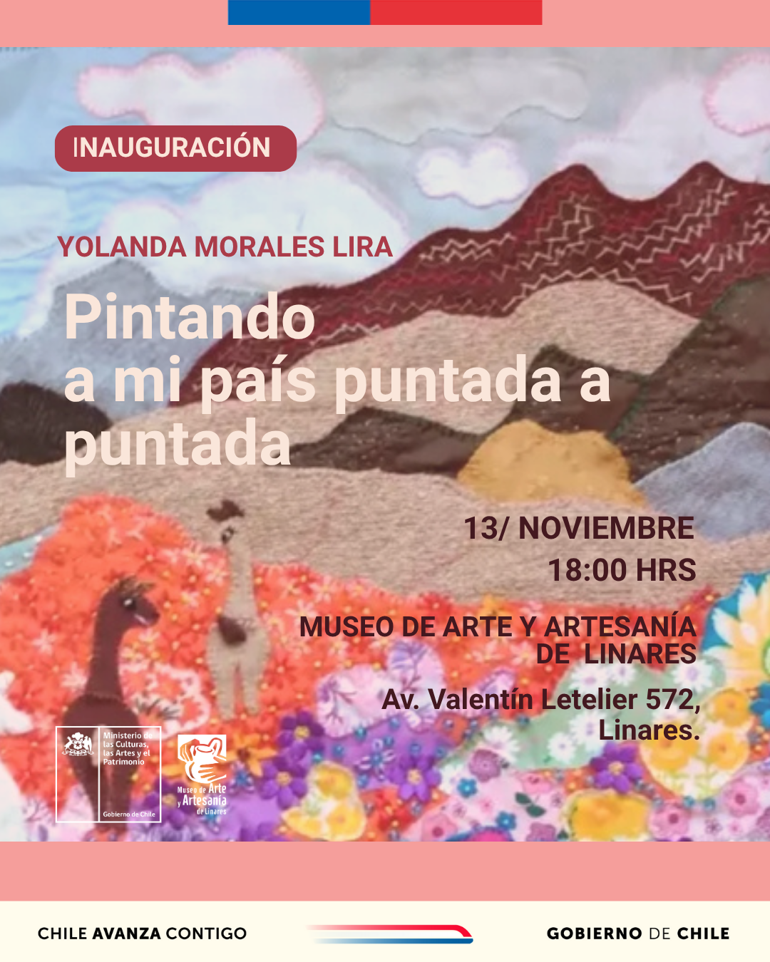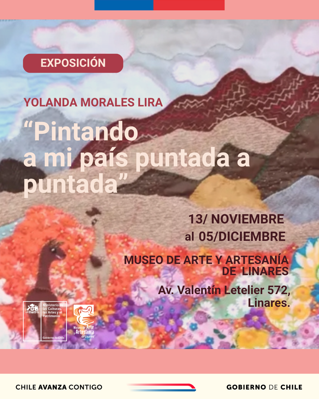 La exposición titulada "Pintando mi país puntada a puntada", realizada por Yolanda Morales, alude al corazón de la cultura chilena, donde reside una profunda conexión con sus raíces, sus paisajes y sus costumbres. Cada pieza en esta colección es más que una simple composición textil; es un lienzo donde se entrelazan la tradición y la expresión artística.