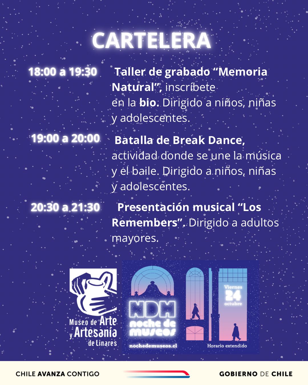 Toda la programación está disponible en https://www.nochedemuseos.cl/